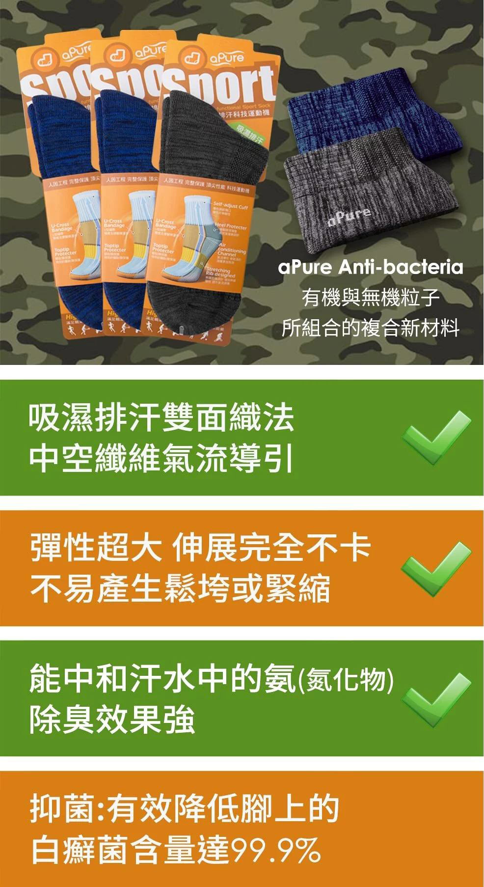 aPure 榮獲歐美特種部隊 ( Special Forces ) 指定織襪加工技術 aPure Anti-bacteria 是一種有機與無機粒子所組合的複合新材料,穿著時明顯提高纖維表面的透氣度,讓微生物不容易生存,能夠有效抑菌