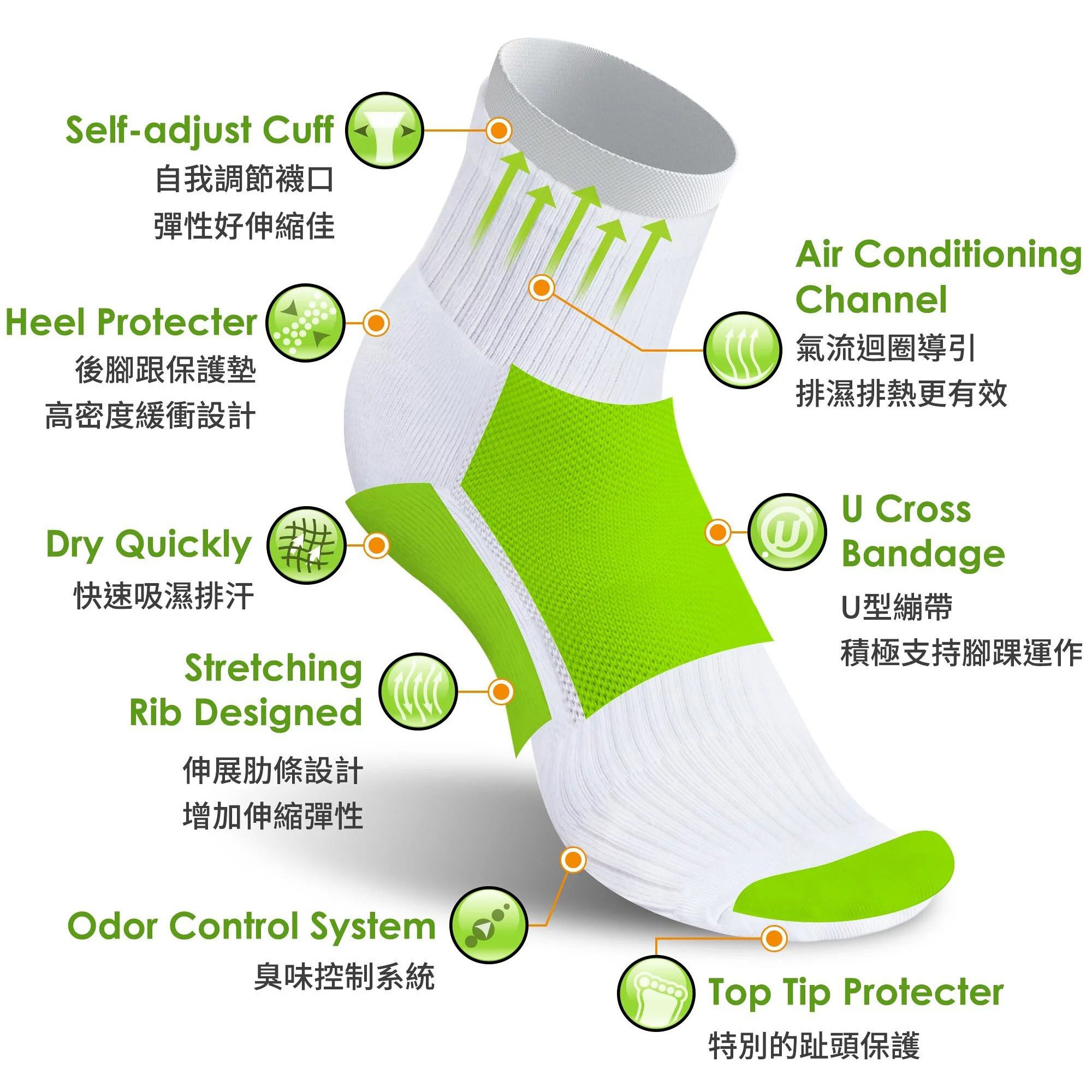 ,將熱量與濕氣帶出,保持自然的腳部乾燥。會呼吸的精細編織網狀結構加上奈米級分解因子可有效分解腐臭及汗液的異味,腳臭明顯降低而且非常乾爽舒適。