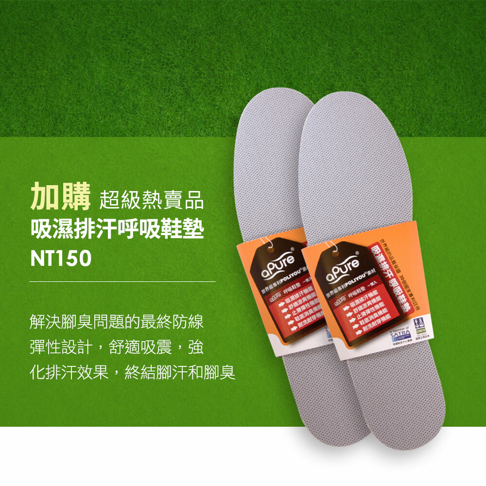 多國專利的 aPure 吸濕排汗呼吸鞋墊,可吸收超過鞋墊體積的汗水,透氣度極佳 (10sec/100ml) 能快速降低腳底溫度及悶熱感,對於汗臭味更有獨特的吸附效果。