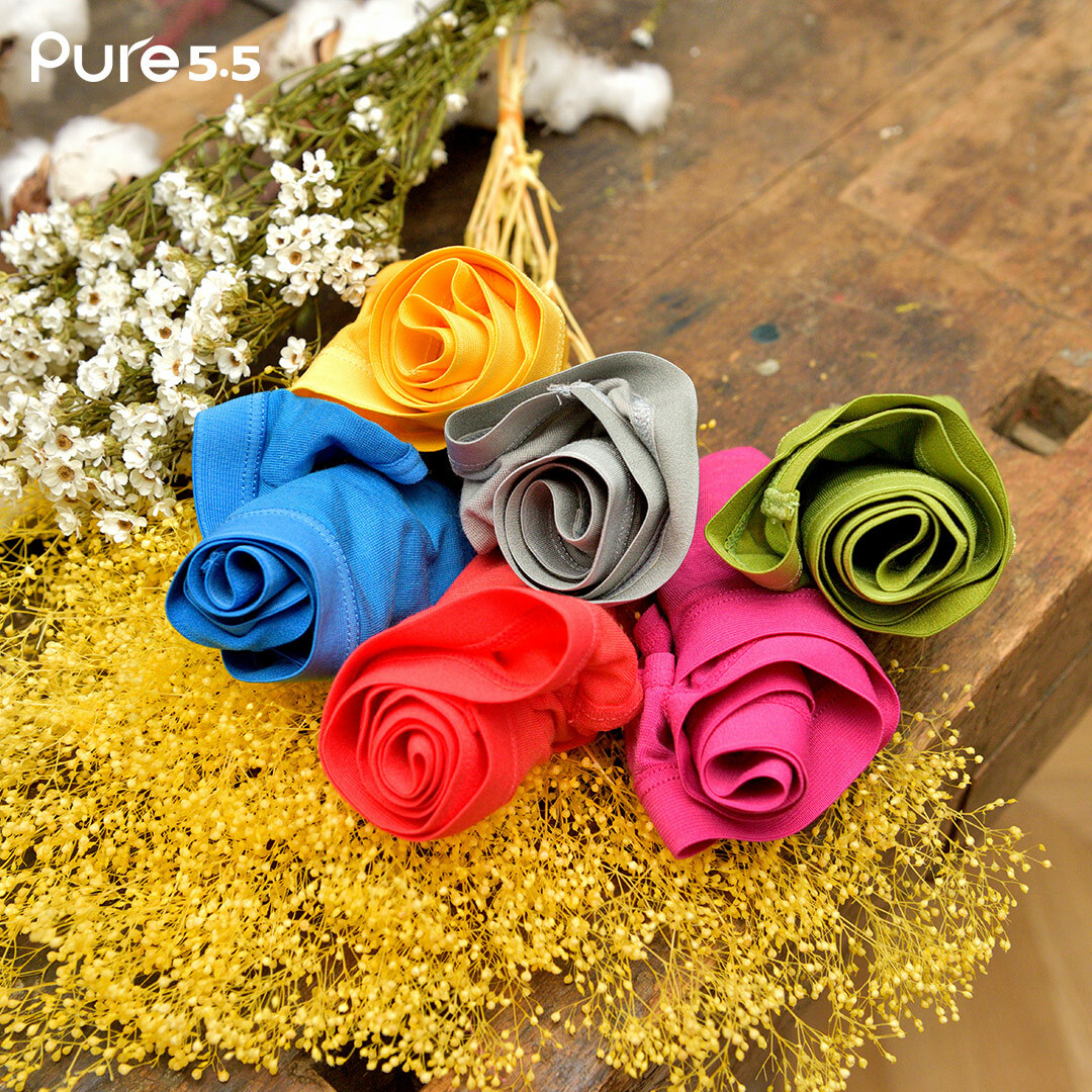 Pure5.5 女內褲專為私密肌衣物打造,完美組合每一種纖維的特質,將日本進口弱酸纖維Acrylate與天絲棉Tencel混紡成一支紗線, 弱酸纖維PH值5~5.5,有益於私密肌好菌快速生長,讓好菌數大於壞菌數,不使用抑菌劑,維持私密肌潔淨最安心。