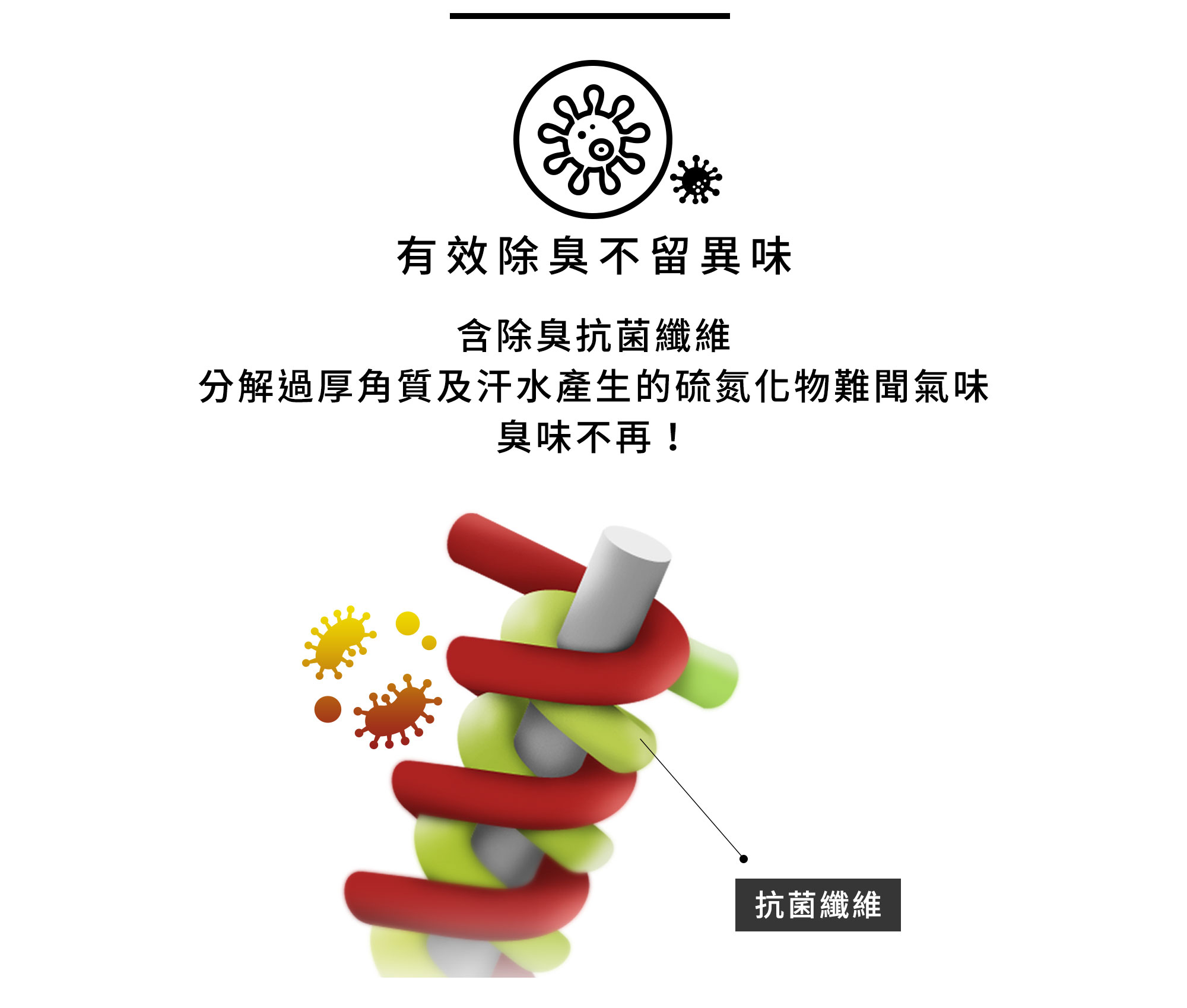 天絲棉及莫代爾纖維給我們最溫柔的觸感、除臭紗及排汗紗能分解角質和汗水作用的難聞氣味、彈性紗能毫無忌諱的自由伸展,好讓我們每天能積極的面對全世界。